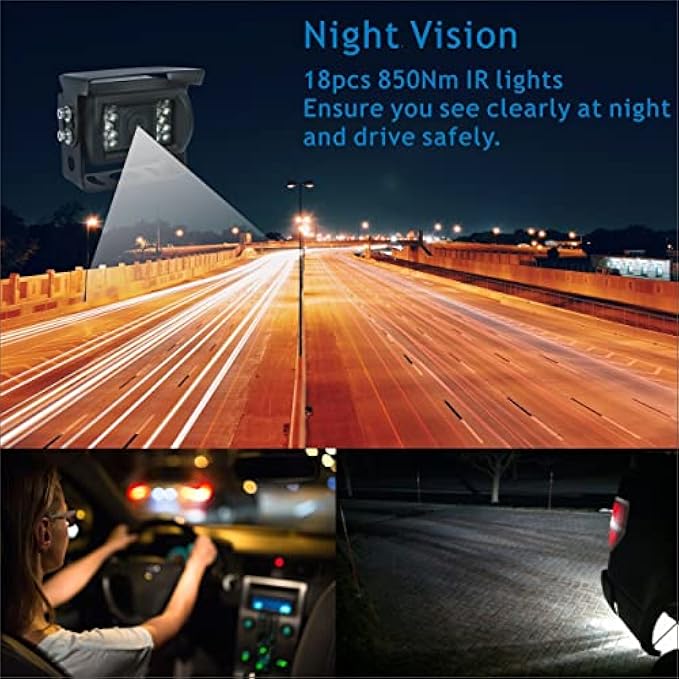 • 【Waterproof and Night Vision】The camera has the highest waterproof and micro-dust proof level IP69K. It not only can resist water, but also prevent the micro-dust from entering the glass. Built-in with 18 IR lights, you can see clearly and drive safe at night or when the ambient light is low. Built-in microphone to transmit the sound to monitor to hear what is happening.