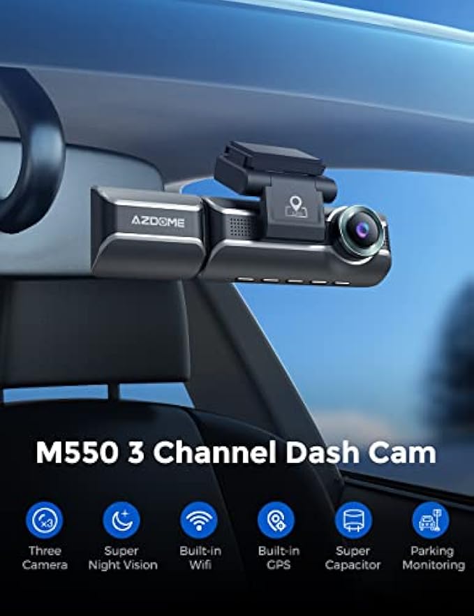 AZDOME M550 Dash Cam 3 Channel, Built in WiFi GPS, With 64GB Card, Front Inside Rear 1440P+1080P+1080P Car Dashboard Camera Recorder, 4K+1080P Dual, 3.19" IPS, IR Night Vision, Capacitor, Parking Mode