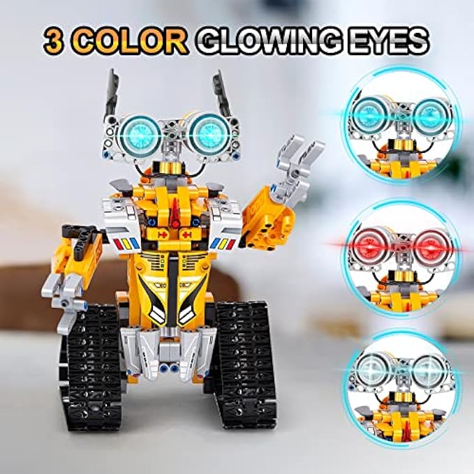 ?【Robots for Kids to Build】 Assembling all 468 pieces together to create a fully operational robot seems like a challenging job, your kids will also have a chance to create their own robot kit, engage themselves in endless hours of creative play. This robotics kit is perfect for kids ages 8 and up lets them put down their phones and iPods. ?【Creative Stem Toys】 Our robot has red blue and white glowing eyes that illuminate in the dark. Adjustable head, flexible rotating hand joints, ground-gripping tracks, which make robot toys move in all directions easily,forward, backward, left and right and 360-degree rotating. Take your kid’s imagination into the character by building this smart robot, transforming block play into pretend play. ?【Advanced Remote & App Control】 One of the main attractions of this robot is 5 modes APP Control (Path mode, Remote Control mode, Gravity mode, Programming mode, Voice control). The RC robot also can be controlled by a 2.4Ghz remote control(the maximum distance is 20m). Remote need 2*3AAA Battery (not included). Different modes will help your kids engage in endless hours of creative play, it is also a good way for children and young adults to learn coding, programming, and other STEM skills. ?【Rechargeable & High-capacity batteries】 You can easily charge your electric remote control robot with included USB cable via the plug, portable power bank, laptop, and so on. This is great robot building kit for kids 6 12, equipped with plus 3.7V/400mAh high-capacity rechargeable lithium-ion battery module, Full charge requires 120 minutes, playing up to 40 minutes. ?【Educational Ideal Gifts】 Our toy robot is ideal for anyone who looking for hours of creative STEM learning through play, which gives educators and parents a tool to provide meaningful STEM education for children at a lower cost.Suitable for festivals or birthday gifts to your kids, friends, or family members. It is an interesting robot building kit for kids 6-12,it is a slightly advanced robot kits for boys 12-15.
