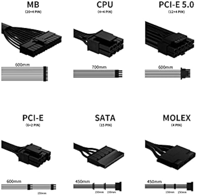• 【Multi-Choice Cable】 Offers cable selection for users: 1*MB (20+4 PIN) | 2*PCI-E (6+2 PIN) | 3*SATA (15 PIN) | 2*CPU (4+4 PIN) | 1*MOLEX (4 PIN) | 1*PCI-E 5.0 (12VHPWR supply power up to 600W TDP to the most advanced graphics cards such as RTX 4080/4090). Low-profile flat black cable are extremely flexible and thin, makes management easier.