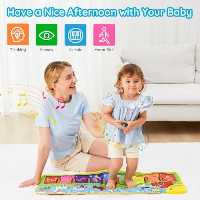 • 【25 Music Sounds】The musical mat contains 25 built-in sounds, including 7 animal sounds, 9 melodies and 9 music keys. This music play mat keeps your child fun for hours and also helps kids to gain music knowledge. There is a mode switch button to switch the melody.