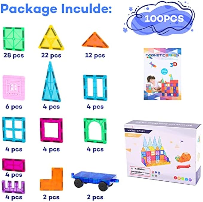 • Magnetic building tiles set: 98 basic shapes plus 2 cars ( squares, triangles, Rectangles, E-shapes,doors,click-ins),with beautiful package and an idea book. Compatible with other brands Superior quality, ASTM-approved, lead-free, ABS plastic, food-grade material, strong magnets sealed within the plastic frame.safe play toys for your kids