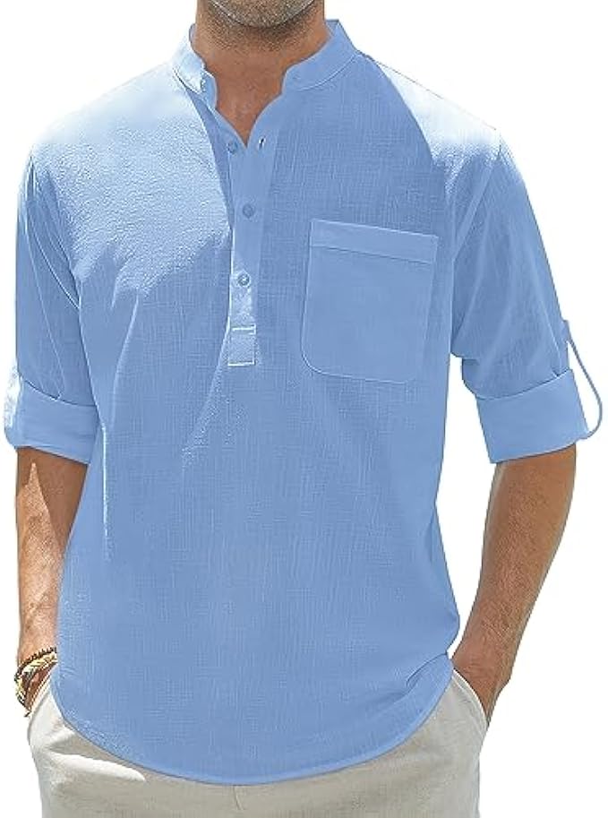 • 【Unique Design】1. Long sleeve with rolled up design 2. One chest pocket makes it easy to store small items. 3. Classic Henry neck design. 4. Extra button--Cotton linen henley shirts are sewn with an eighth button, which you can use if needed