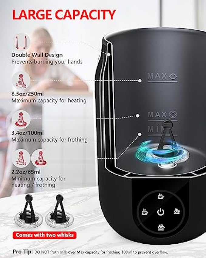 • FROTHS IN MINUTES: Featuring powerful upgraded motor and whisk work together to make wonderful, delicious rich milk foam at home in 1-2 minutes, perfect for DIY your favorite beverage, like matcha, lattes, macchiato, cappuccinos and hot chocolate. Let's make a barista-level coffee now!