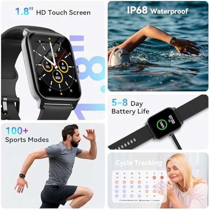 • 【Smart Life Partner & DIY Background】Multi-functional Smart Watch with 1.8"HD Extra-large full touch screen brings you a unique visual and better interactive experience. You can upload your favorite pictures as your watch faces. It contains many daily useful tools, such as Noise monitoring, Message reminder, Weather forecast, Music control, Stress monitoring, Setting alarms, Stopwatch, timer, Sedentary reminder, Breather guide, Raise to wake, Find phone, adjustable brightness and more.