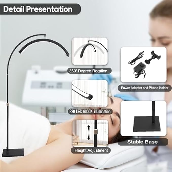 • 【Adjustable Height】The height of this half moon floor lamp is adjustable from 37 to 68 inches, accommodating beauty chairs and beds of varying heights. Whether you have a low lash workbench or standard lash chair, this lamp adjusts for a perfect fit, lending a professional look.