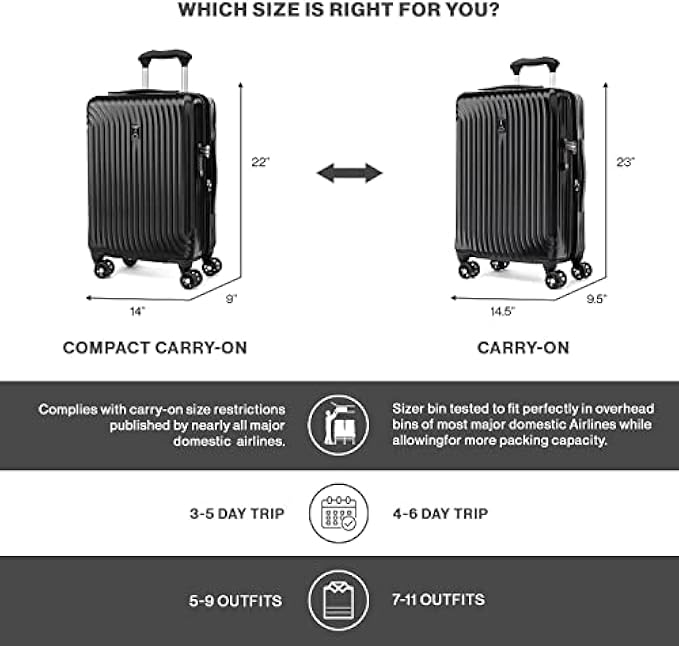 • Sizer bin tested to fit in the overhead bins of most major domestic airlines while allowing for more packing capacity. 8 Spinner wheels rotate 360, providing superior maneuverability and a smooth glide in every direction