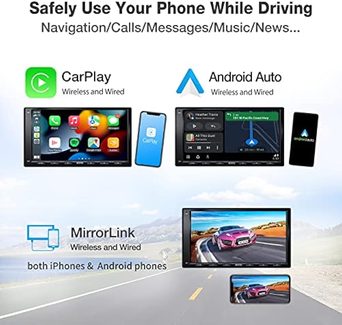 • 【CarPlay, Android Auto & Wireless MirrorLink】Wired and WIRELESS CarPlay/Android Auto. Run online navigation either in CarPlay or Android Auto, or directly on A6 PF; or download maps to A6 PF and get directions offline (built-in GPS). Make calls, send/receive sms, listen to music/podcasts in CarPlay or Android Auto while you focus on driving. Apps and contents not supported by CarPlay or Android Auto can be displayed on A6 PF with MirrorLink.